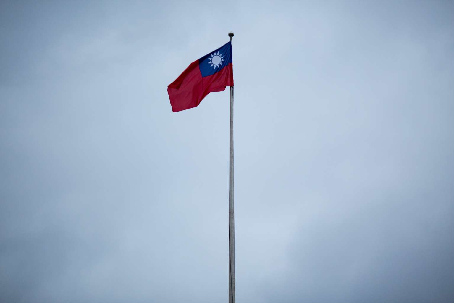 The Taiwan flag flies on a pole in the Chiang Kai-shek Memorial Hall square in Taipei, Taiwan.