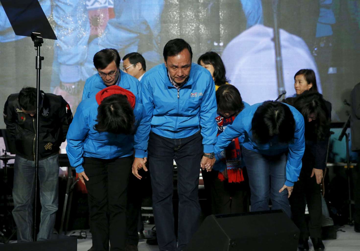 Kuomintang Party presidential candidate Eric Chu (centre) and his wife Kao Wan-ching (right) bow as he concedes defeat on Jan 16, 2016.