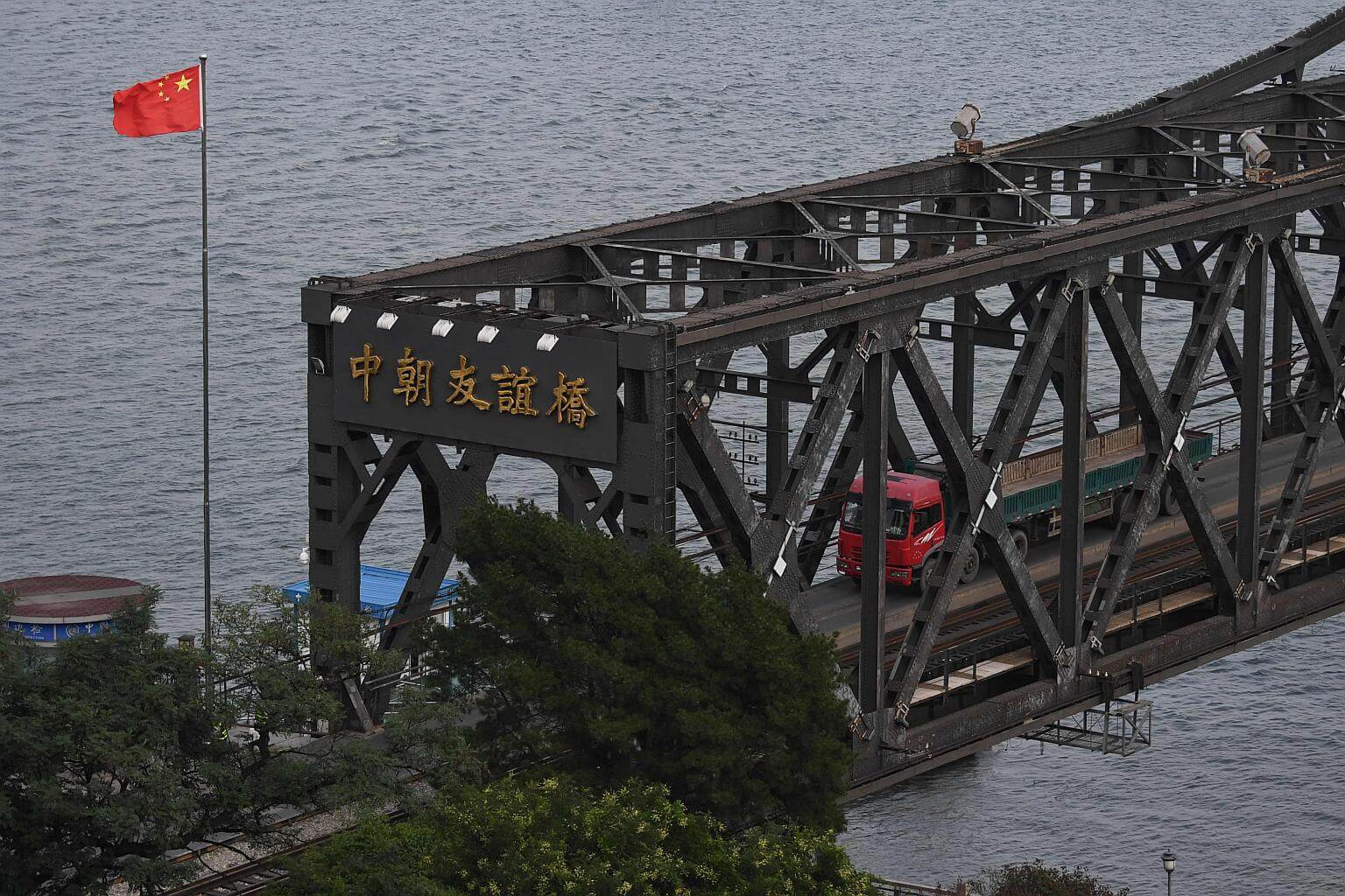 A truck returning from North Korea on the Friendship Bridge at the Chinese border city of Dandong opposite the North Korean town of Sinuiju.