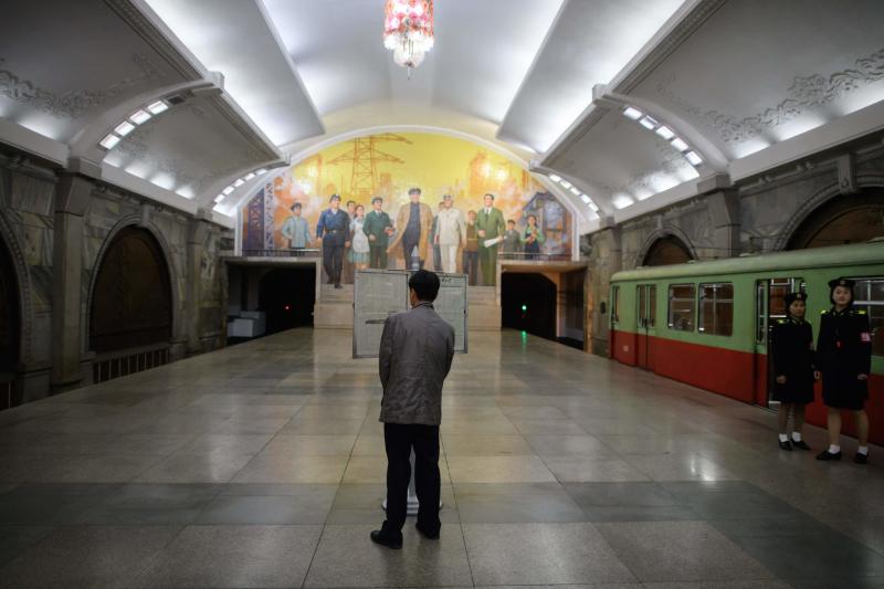 A commuter reads a newspaper displayed on the platform of a subway station in Pyongyang.