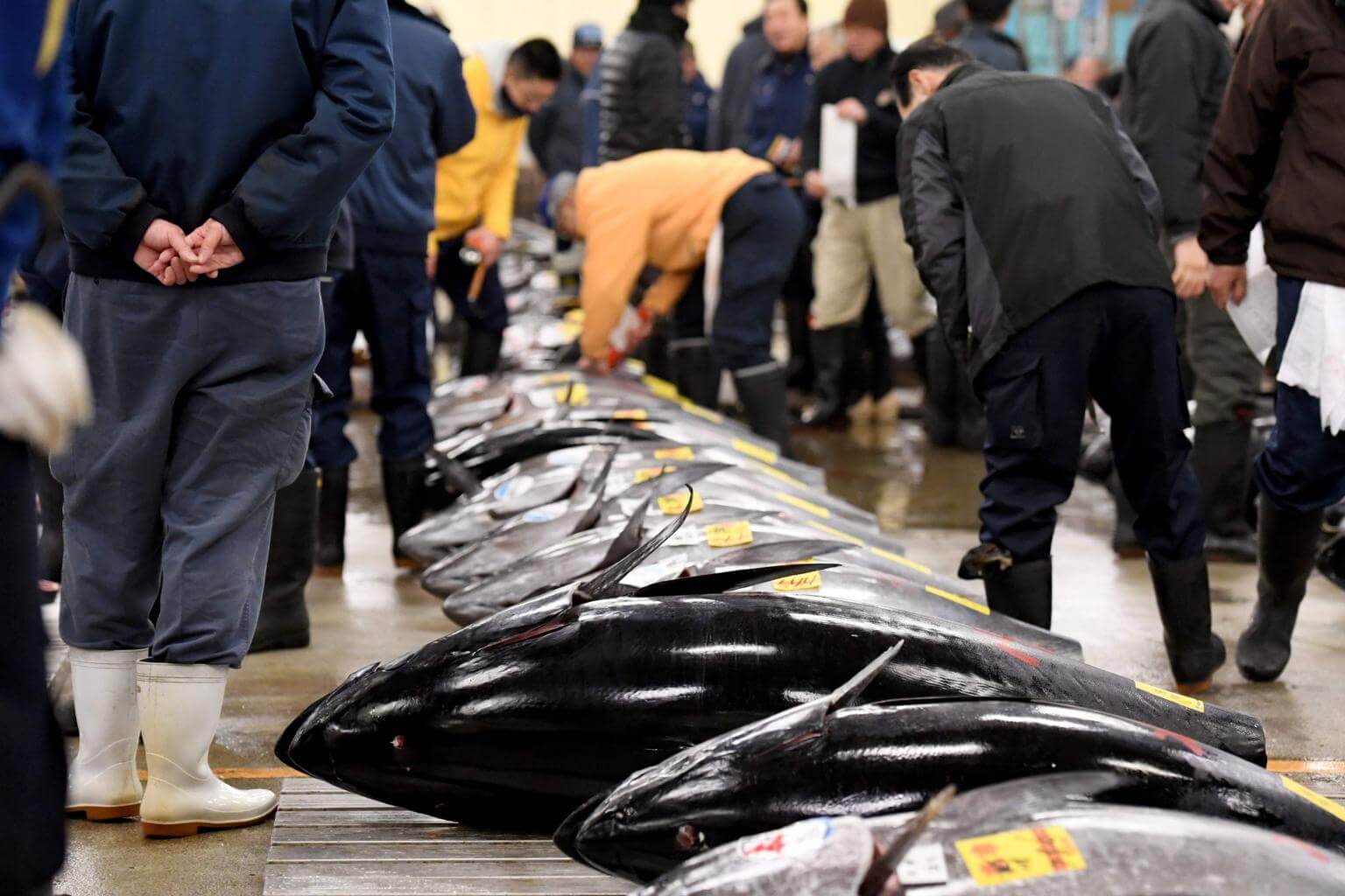 Fishmongers inspecting bluefin tuna at Tsukiji fish market in Tokyo on Jan 5, 2017.