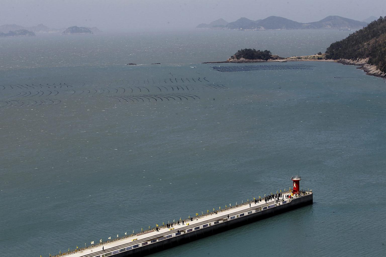 Visitors walking on the seawall to remember the victims of the Sewol ferry sinking at Jindo-port, on Jindo Island, South Korea, on April 15, 2016.