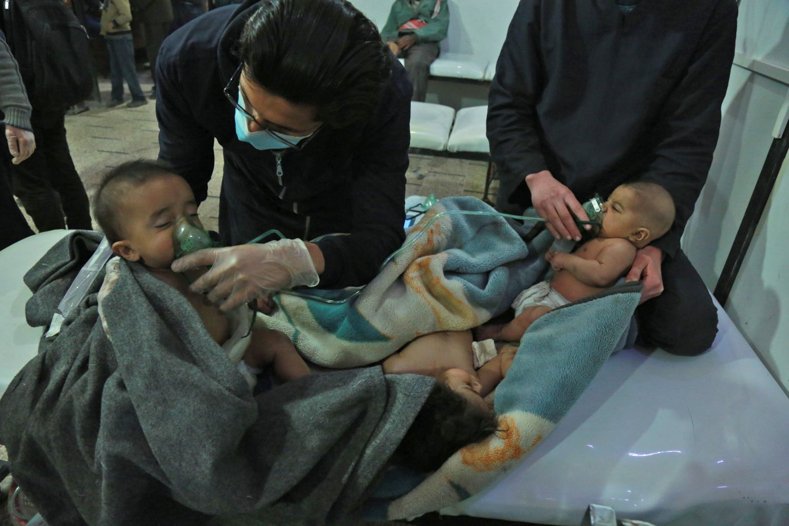 Syrian babies receive treatment for a suspected chemical attack on the rebel-held village of al-Shifuniyah in the Eastern Ghouta region on the outskirts of the capital Damascus, on Feb 25, 2018.