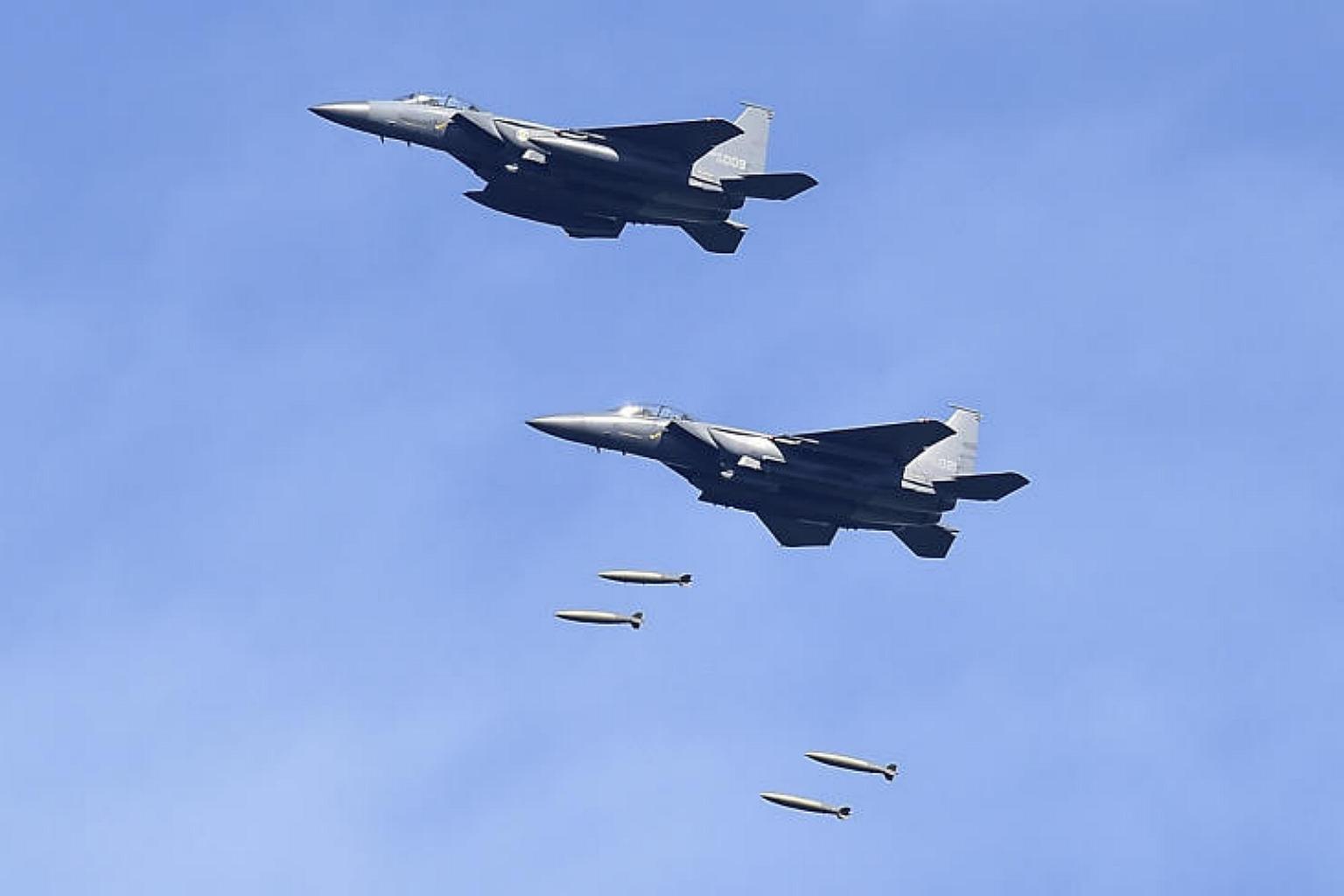 An undated handout photo of F-15K fighter jets with the South Korean military dropping bombs during training at a firing range in South Korea, on Aug 29, 2017.