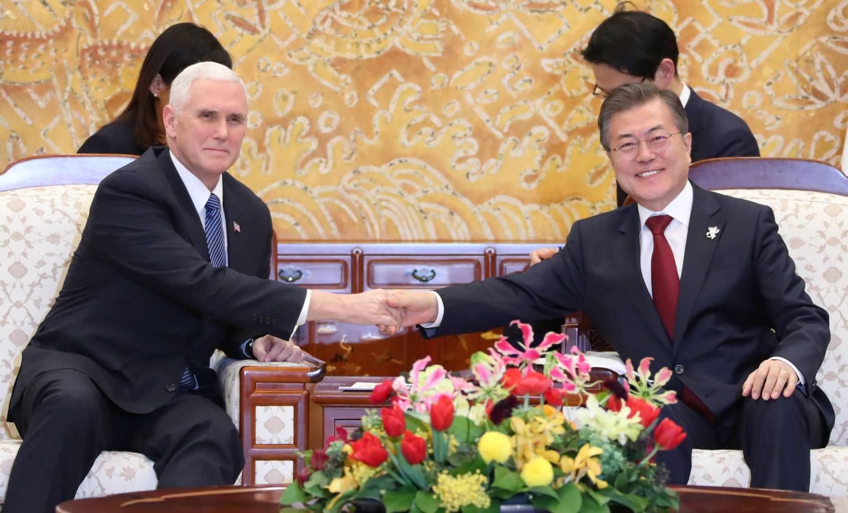 Korean President Moon Jae In shakes hands with US Vice-President Mike Pence during their talks at the presidential office Cheong Wa Dae (Blue House) in Seoul on Feb 8, 2018.