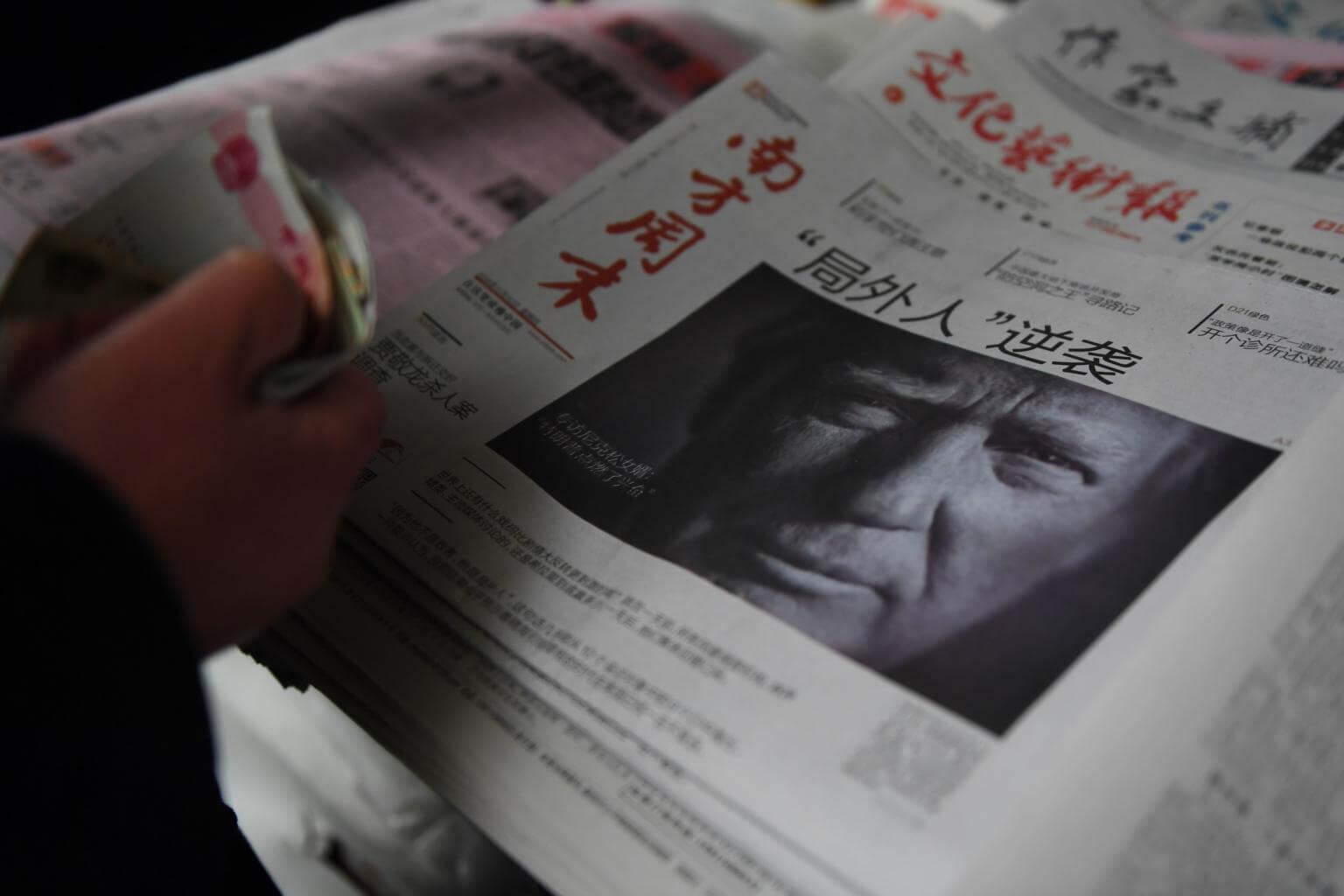 A man buys a Chinese newspaper featuring Donald Trump on the front page in Beijing on Nov 10, 2016.