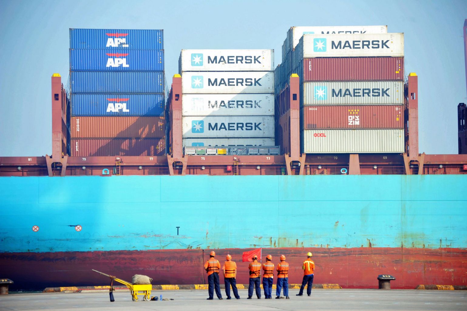 Chinese workers look at a cargo ship loaded at a port in Qingdao, Shandong province.
