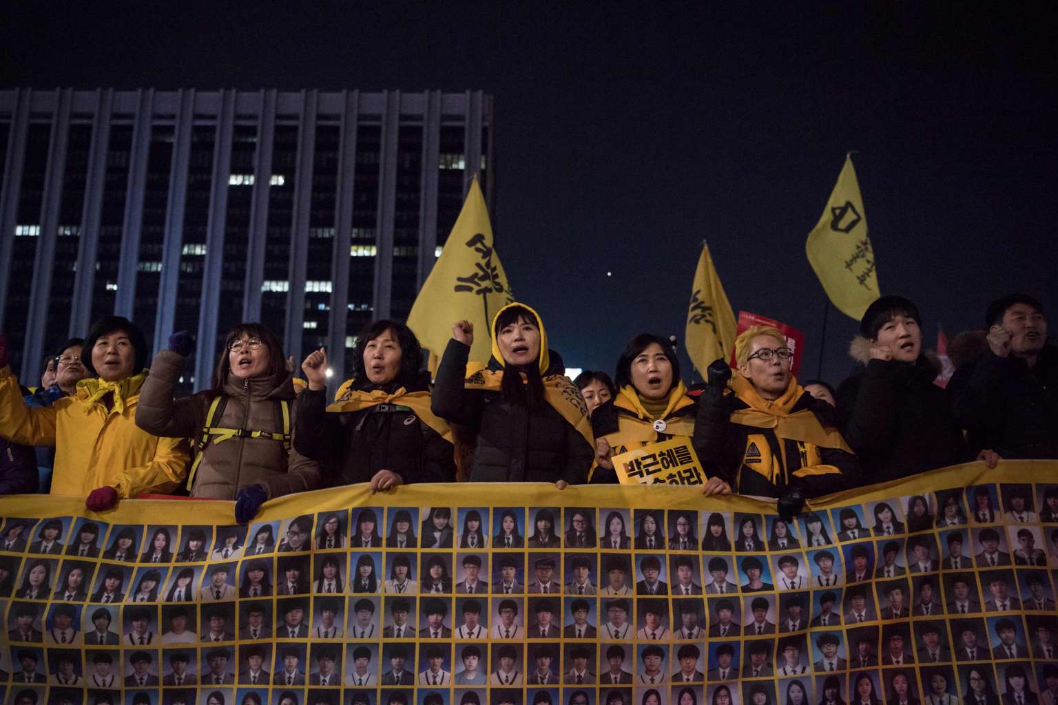 Relatives of victims of the 2014 Sewol ferry disaster join anti-government activists during a rally in Seoul on March 4, 2017.