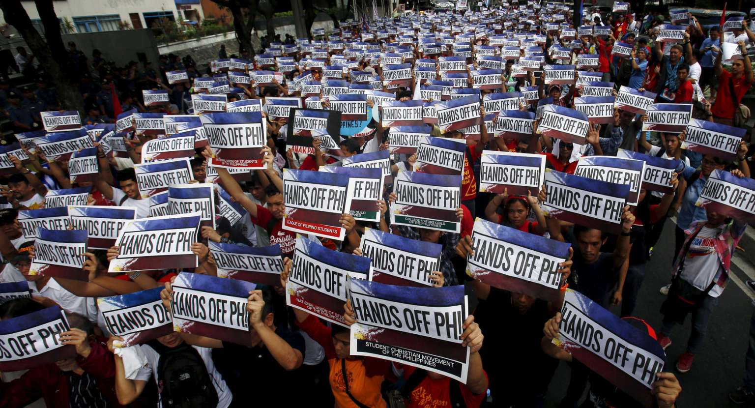 Activists hold up signs during a protest over the South China Sea disputes outside the Chinese Consulate in Makati City, Metro Manila on June 12, 2015.