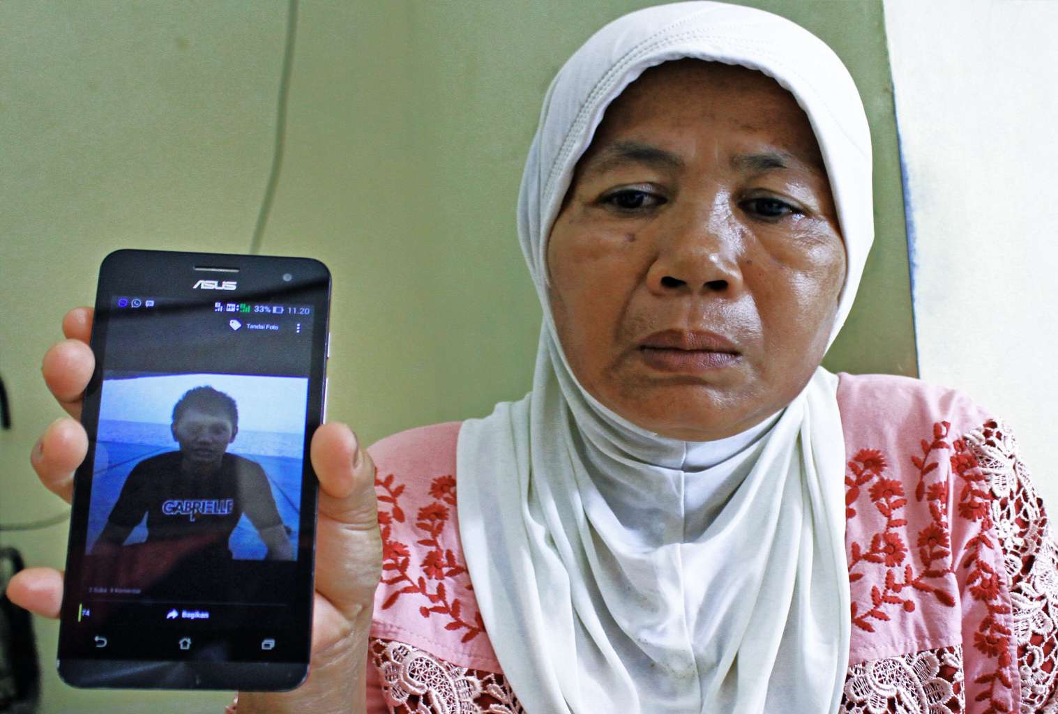 Indonesian mother Asmizar showing a photograph of her son Wendy Rahadian, who was one of the 10 men kidnapped by Abu Sayyaf on March 26, 2016.