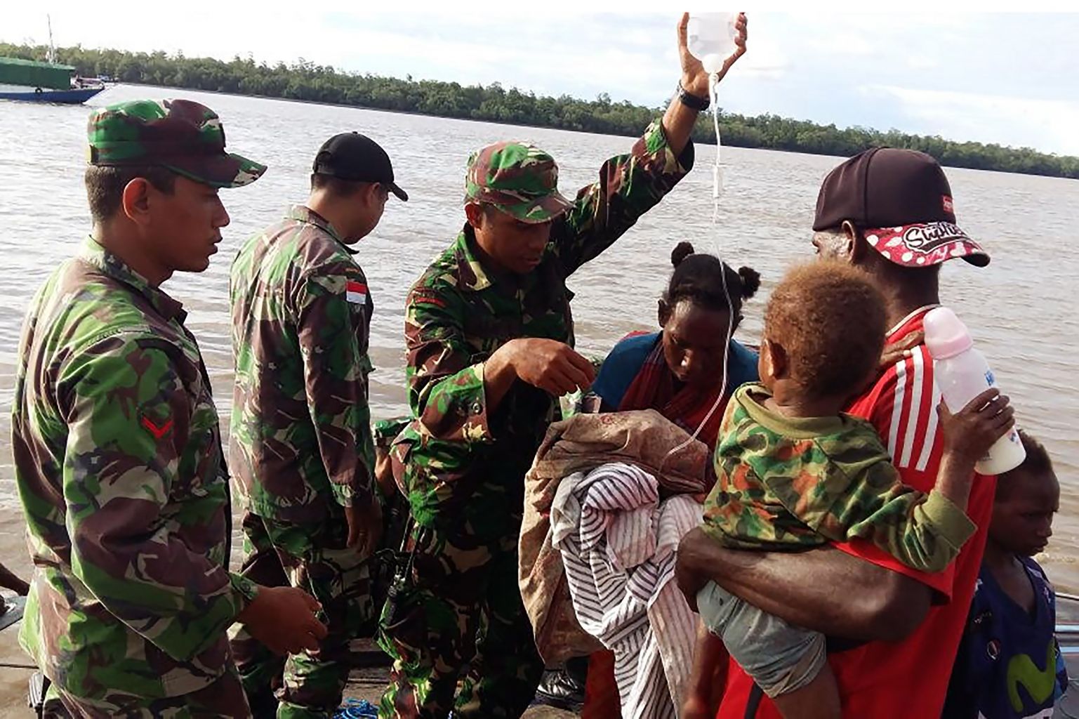 Indonesian military personnel tending to children suffering from malnutrition in Asmat, Papua Province, on Jan 20, 2018.