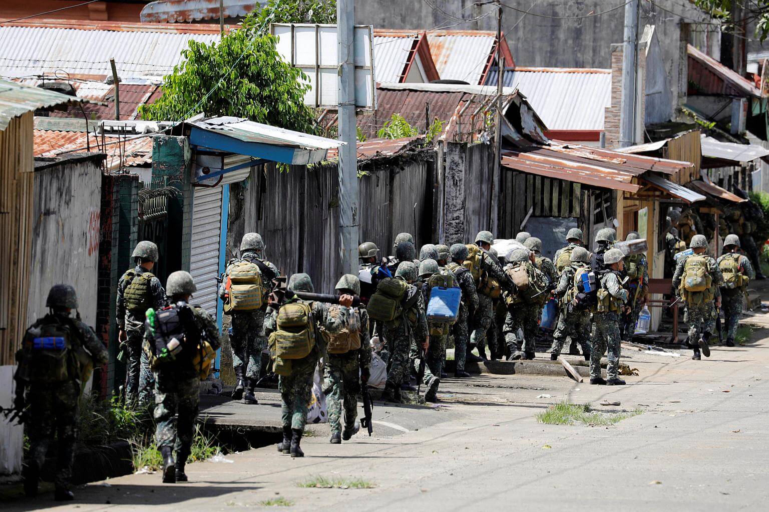 Philippine Marines advance their positions as more soldiers reinforce to fight the Maute group in Marawi City, on May 29, 2017.