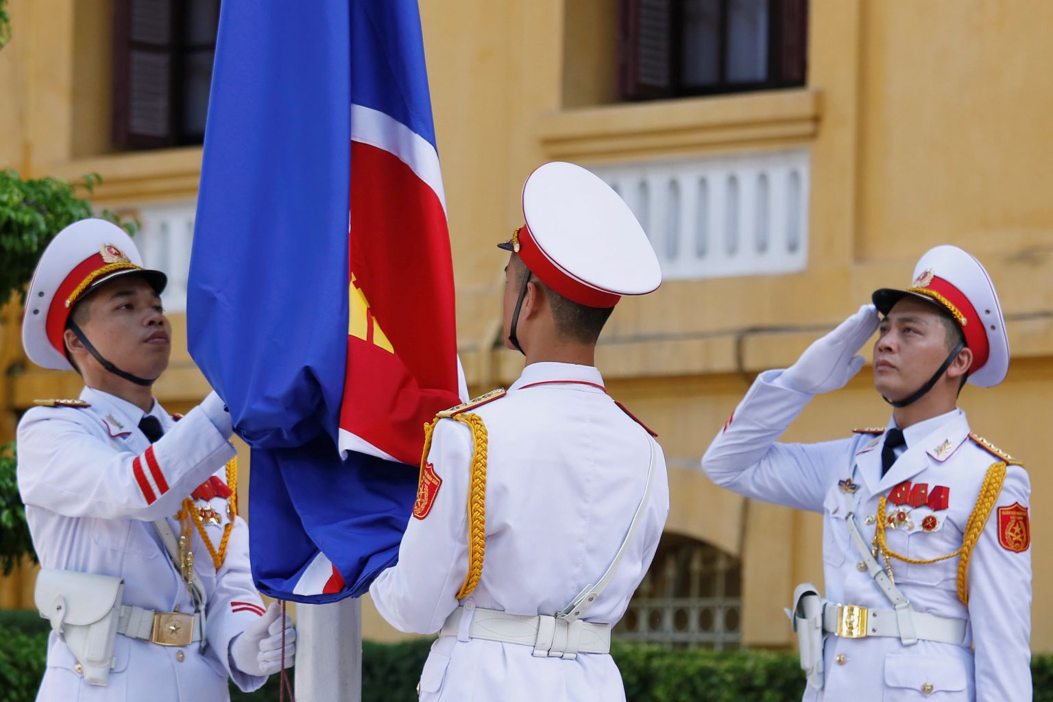 Honour guards raise an Association of Southeast Asian Nations (Asean) flag at a flag-raising ceremony to mark the 50th anniversary of the regional group at Vietnam's Ministry of Foreign Affairs.