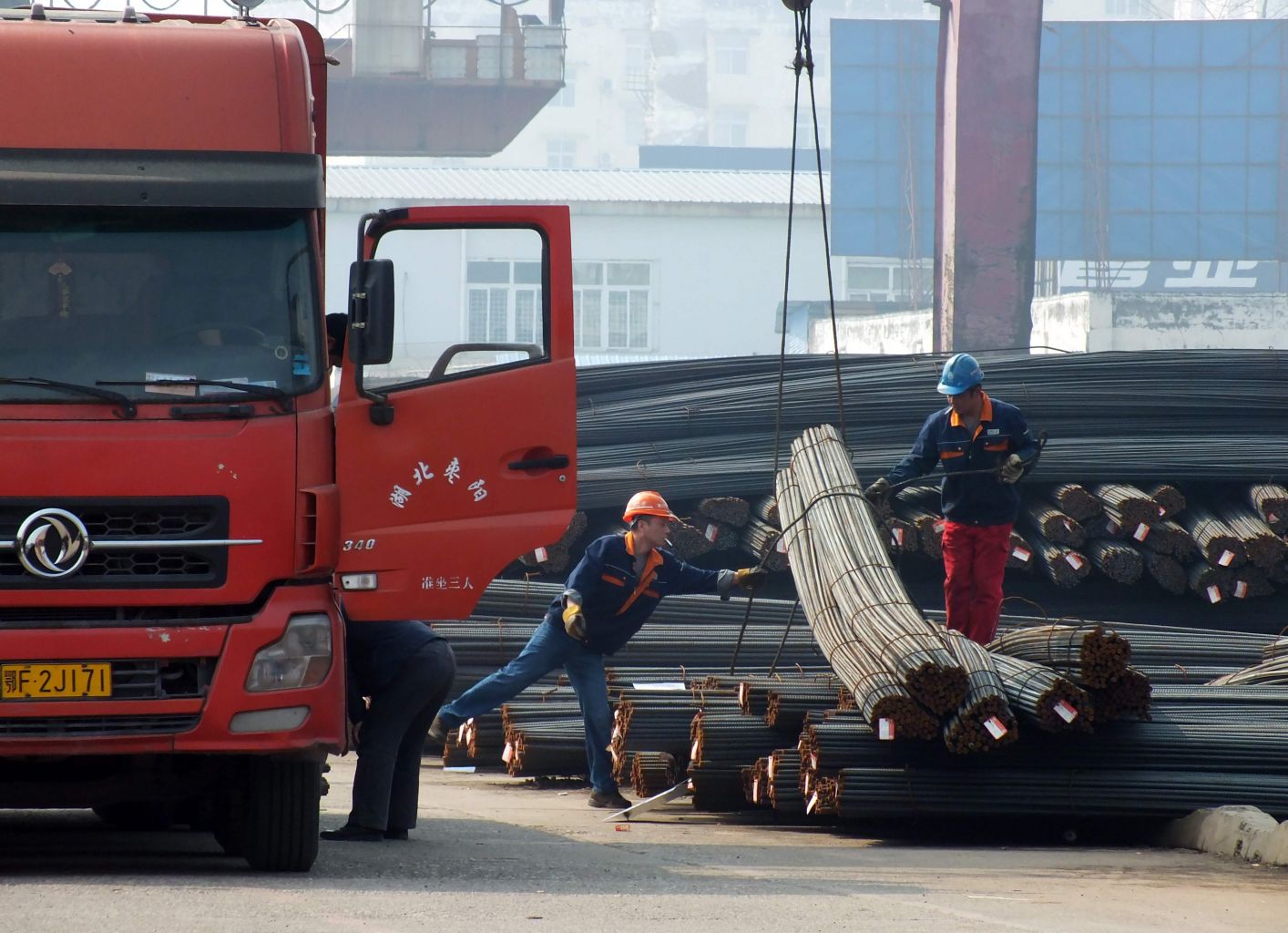Labourers work at a steel market in Yichang, China, on March 4, 2016.