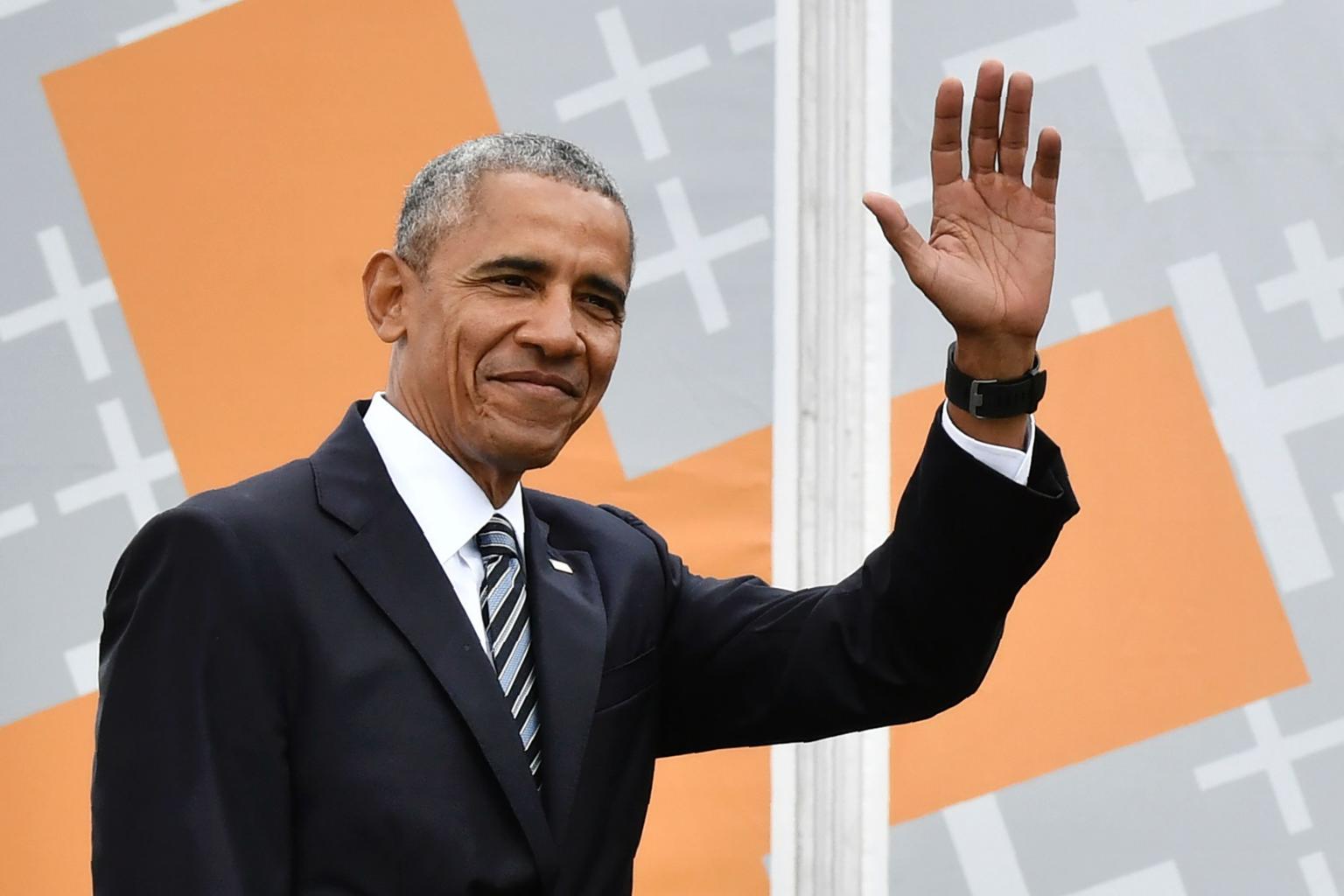 Former US president Barack Obama waving as he arrives on stage before attending a discussion with the German Chancellor during the Protestant church day (Kirchentag) event at the Brandenburg Gate in Berlin on May 25, 2017.