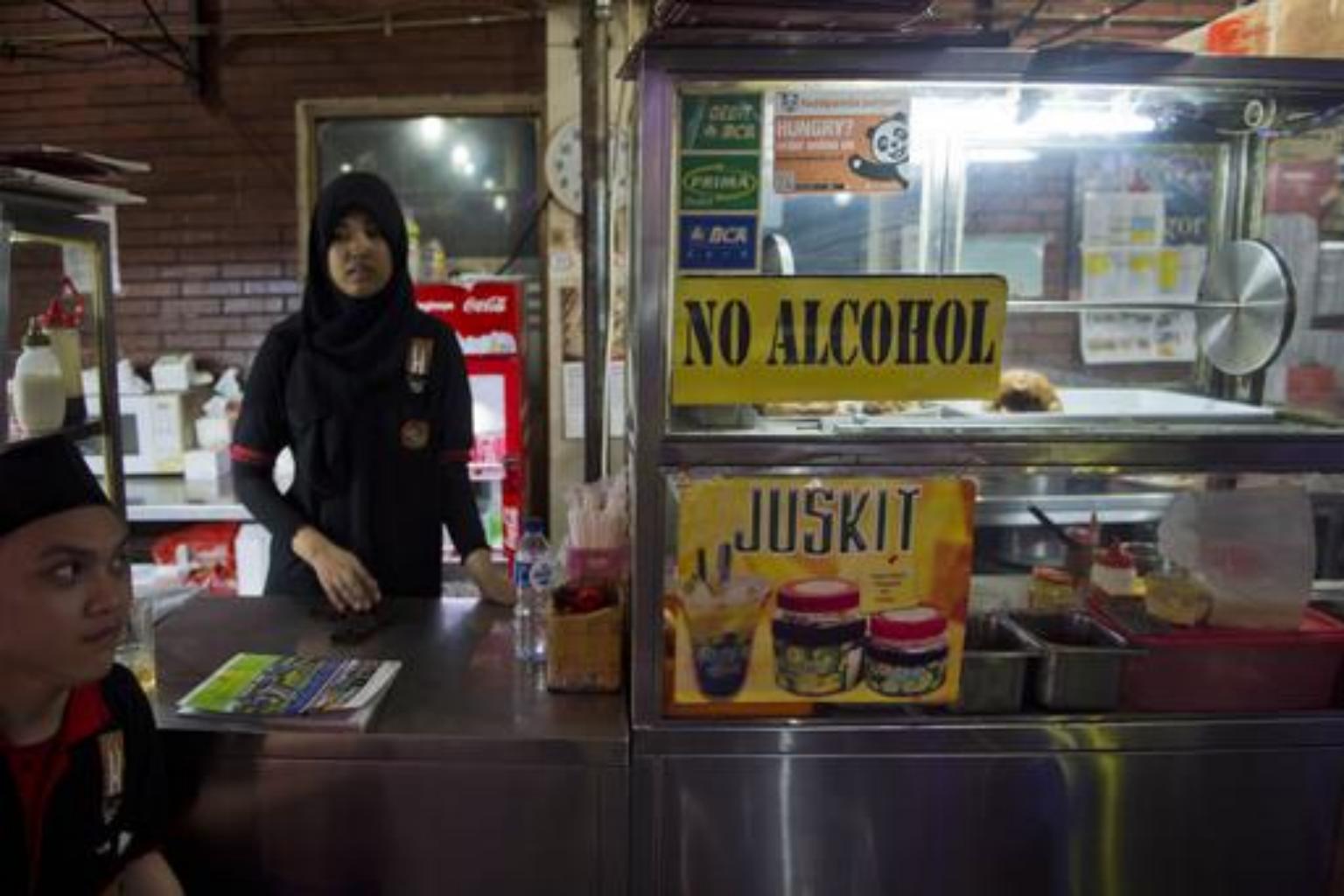 A restaurant worker waits for customers as a 'no alcohol sign' is displayed on the food stall in a tourist district in Jakarta.