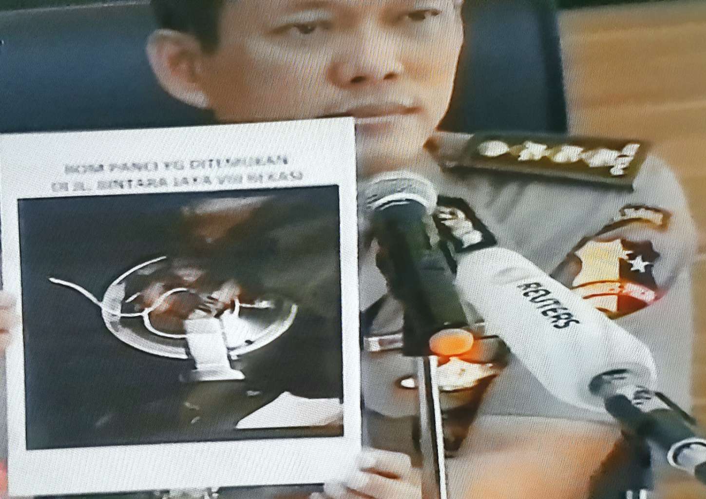 Jakarta police spokesman Awi Setiyono showing a photograph of the "rice cooker bomb".