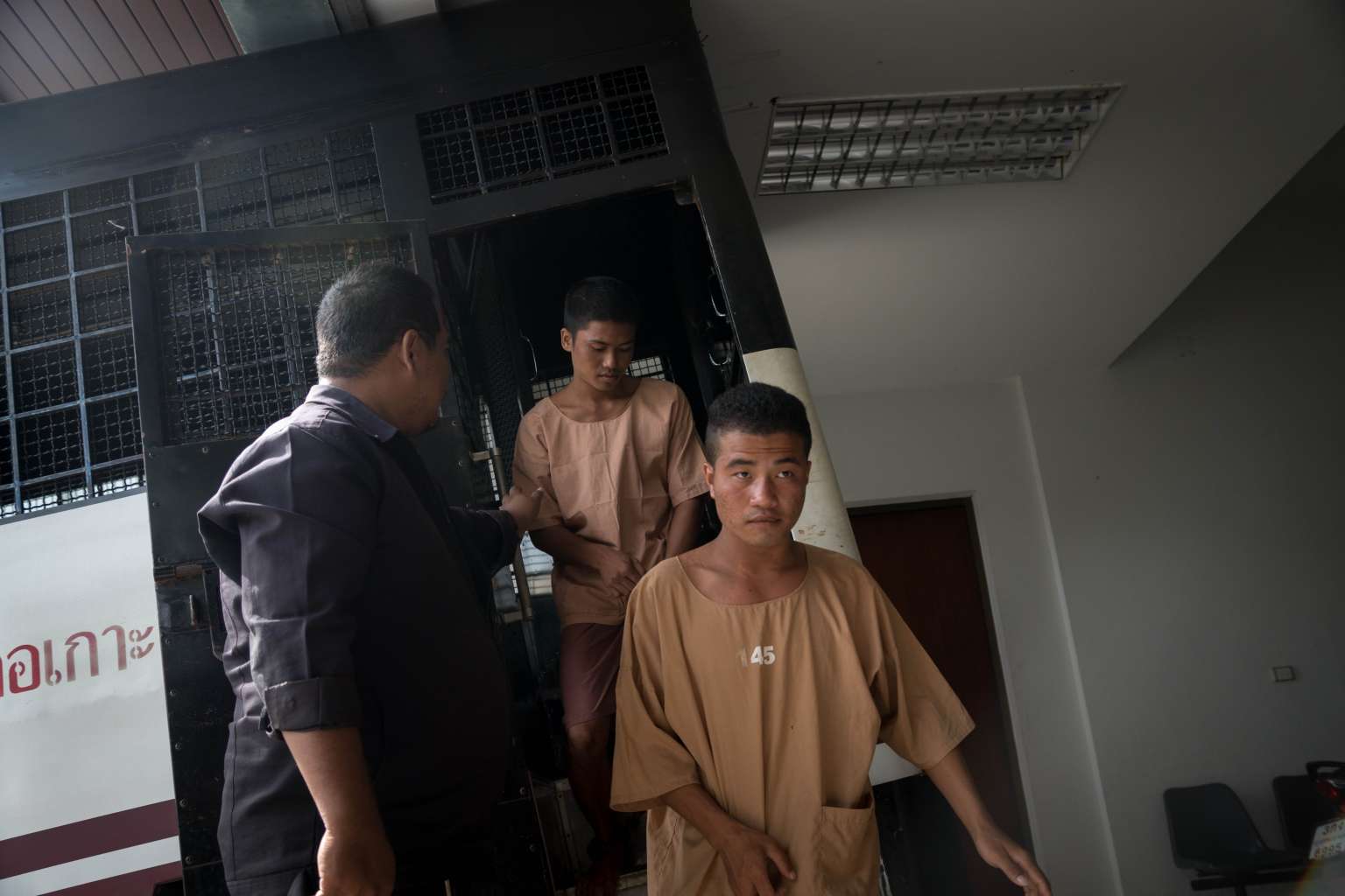 Myanmar national Zaw Lin (right) arrives in a prison transport van outside Koh Samui courthouse as fellow Myanmar national Win Zaw Tun follows on the Thai resort island of Koh Samui on Jul 9, 2015.