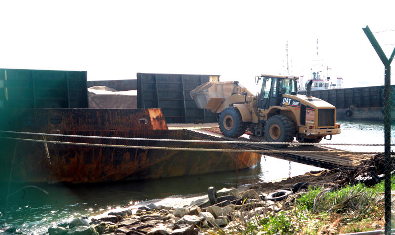 A bulldozer unloads sand for the construction industry from a barge at Tuas South Avenue 3 Agregate Terminal.