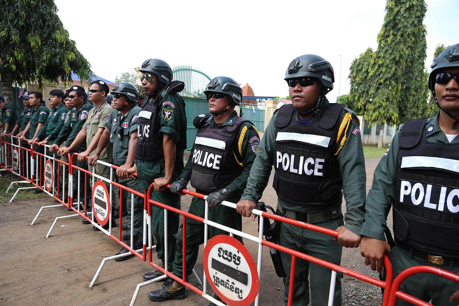Cambodian police man a barricade outside a prison in Trapaing Phlong in Tbong Khmum province on Sept 11, 2017, where opposition leader Kem Sokha is being held after being detained last week.