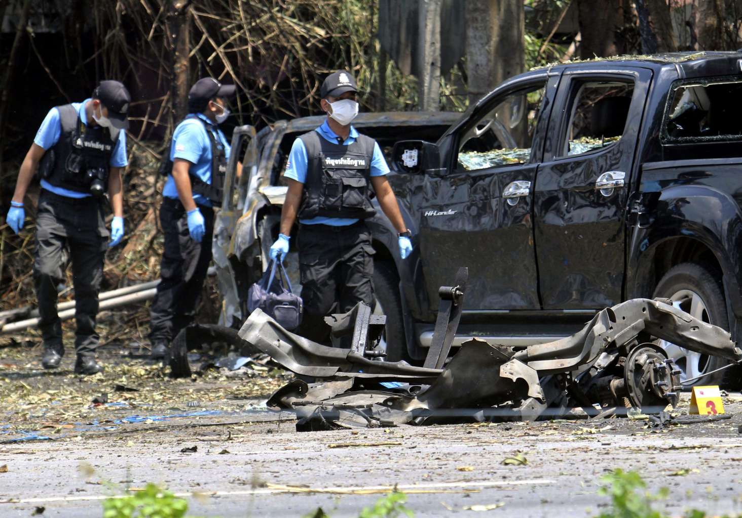 Police officers inspecting the site of a bomb blast at a checkpoint in Pattani province, southern Thailand, on July 5, 2016.