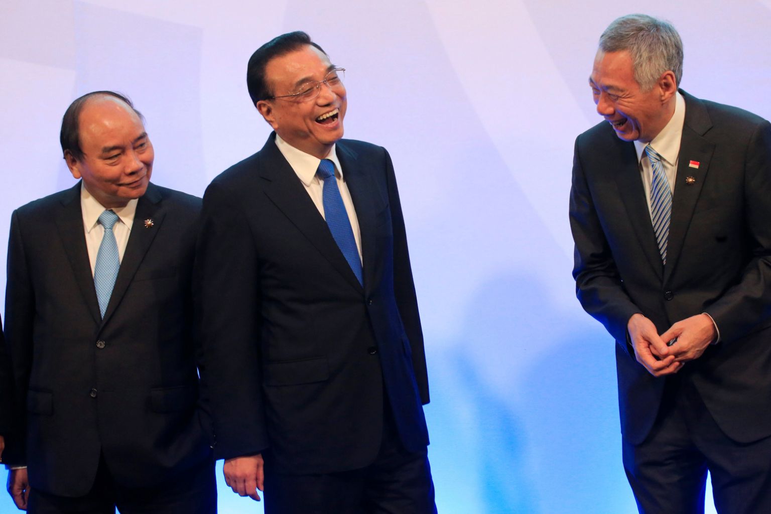 Chinese Premier Li Keqiang (centre) shares a light moment with Singapore's Prime Minister Lee Hsien Loong (right) while Vietnam's Prime Minister Nguyen Xuan Phuc looks on during the 20th Asean-China Summit in Manila on Nov 13, 2017.