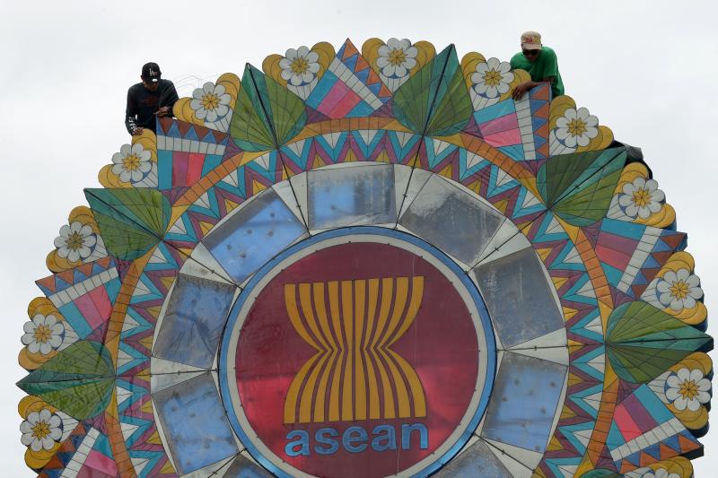 Labourers working on a giant lantern decorated with the logo for the Association of South-east Asian Nations (Asean) displayed at the entrance to the venue of the Asean Regional Forum meeting in Manila, on Aug 3, 2017.