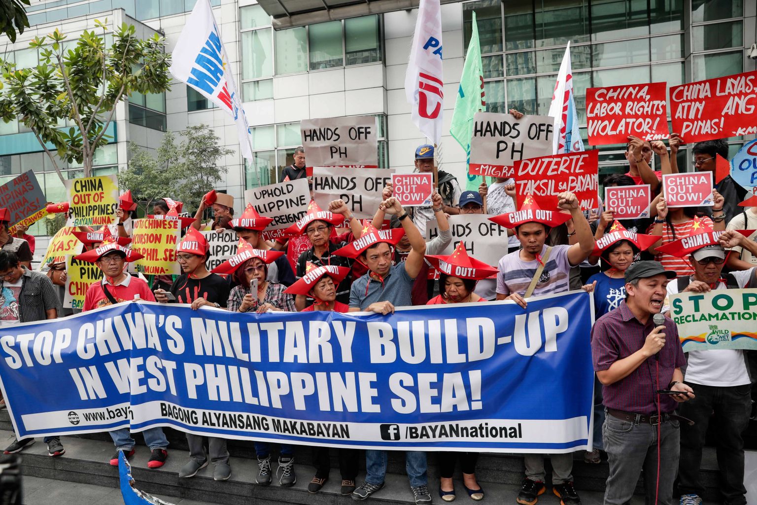 Activists shouting slogans outside the Chinese Embassy in Makati City in the Philippines, on Feb 10, 2018.