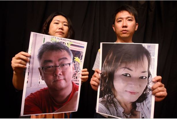 Mrs Chan Wai See (left) and Mr Chung Chin Lung hold up pictures of hostages Mr Bernard Then Ted Fun (left) and Ms Thien Nyuk Fun.