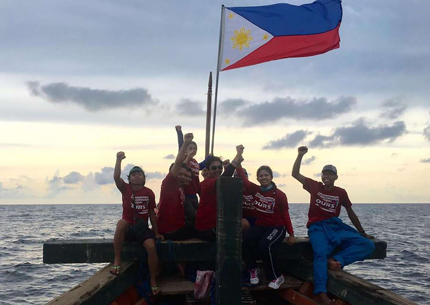 Members of the group Kalayaan Atin Ito (Freedom This Is Ours) raise their fists next to the Philippines flag as they sail to Scarborough Shoal to protest China’s occupation of the marine feature.