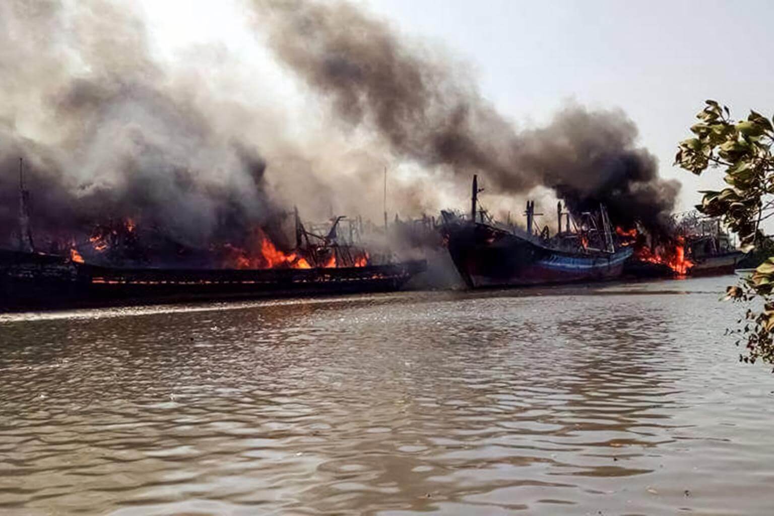 Smoke rise up from the blaze of traditional fishing boats in Pati, Central Java province, on July 15, 2017, as fire services are struggling to put out the billowing blaze at a riverside port on the northern coast of Java island.