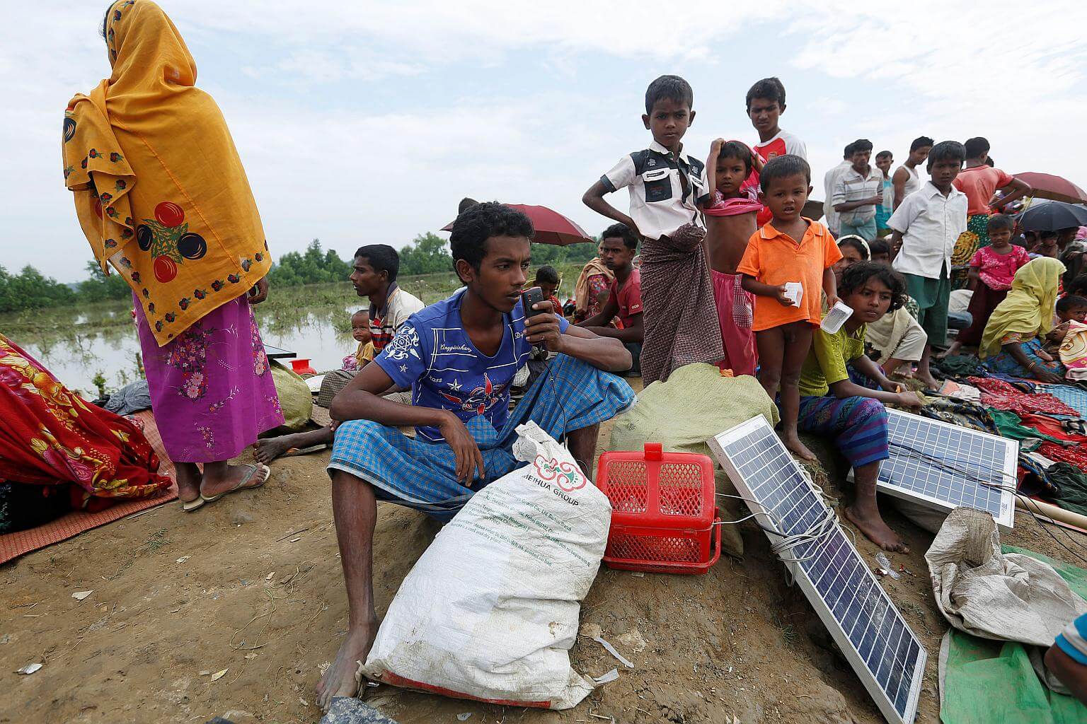 A Rohingya refugee charges his phone with a solar panel as he waits to be taken to a refugee camp, on Nov 2, 2017.