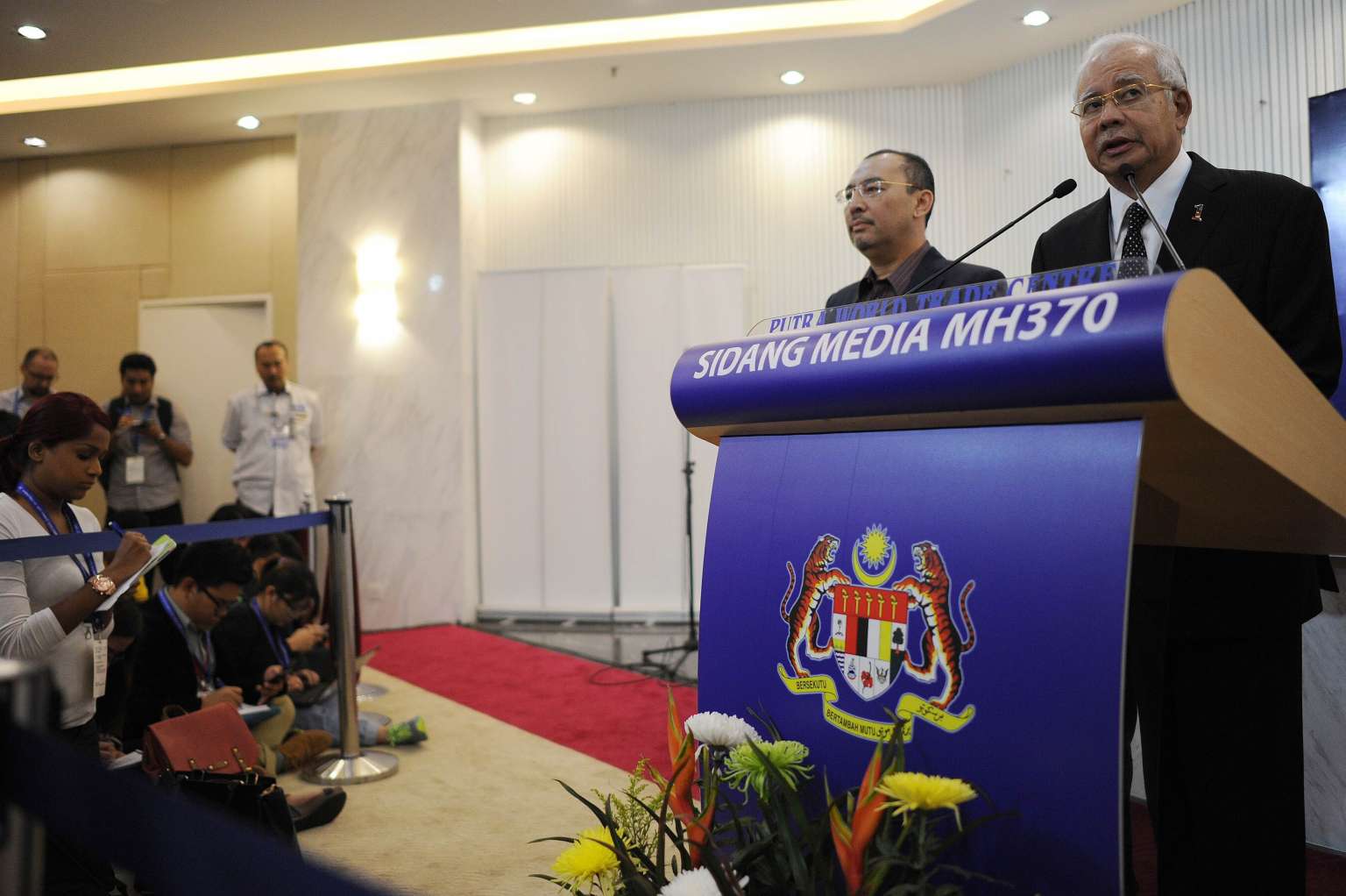 Malaysia's Prime Minister Najib Razak (right) delivering a statement on the Malaysia Airlines flight MH370.