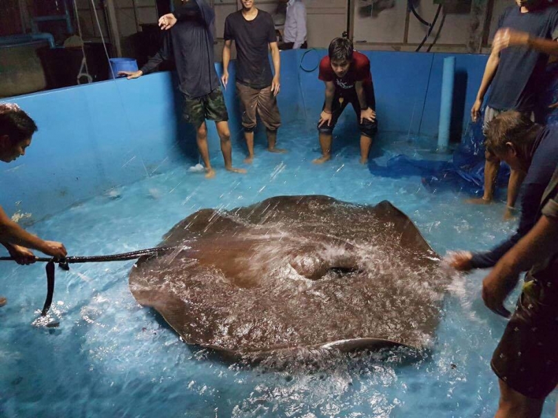 "We received a report from local residents on Friday night that they had found one living female stingray washed ashore. She was two metres wide and four metres long and it was estimated that she was more than 40 years old. Luckily, we could save this precious animal and bring her to the station. Right now her condition is better, as she can swim and move by herself, but we have to let her rest here until the river conditions are better," Mr Joerakate said.