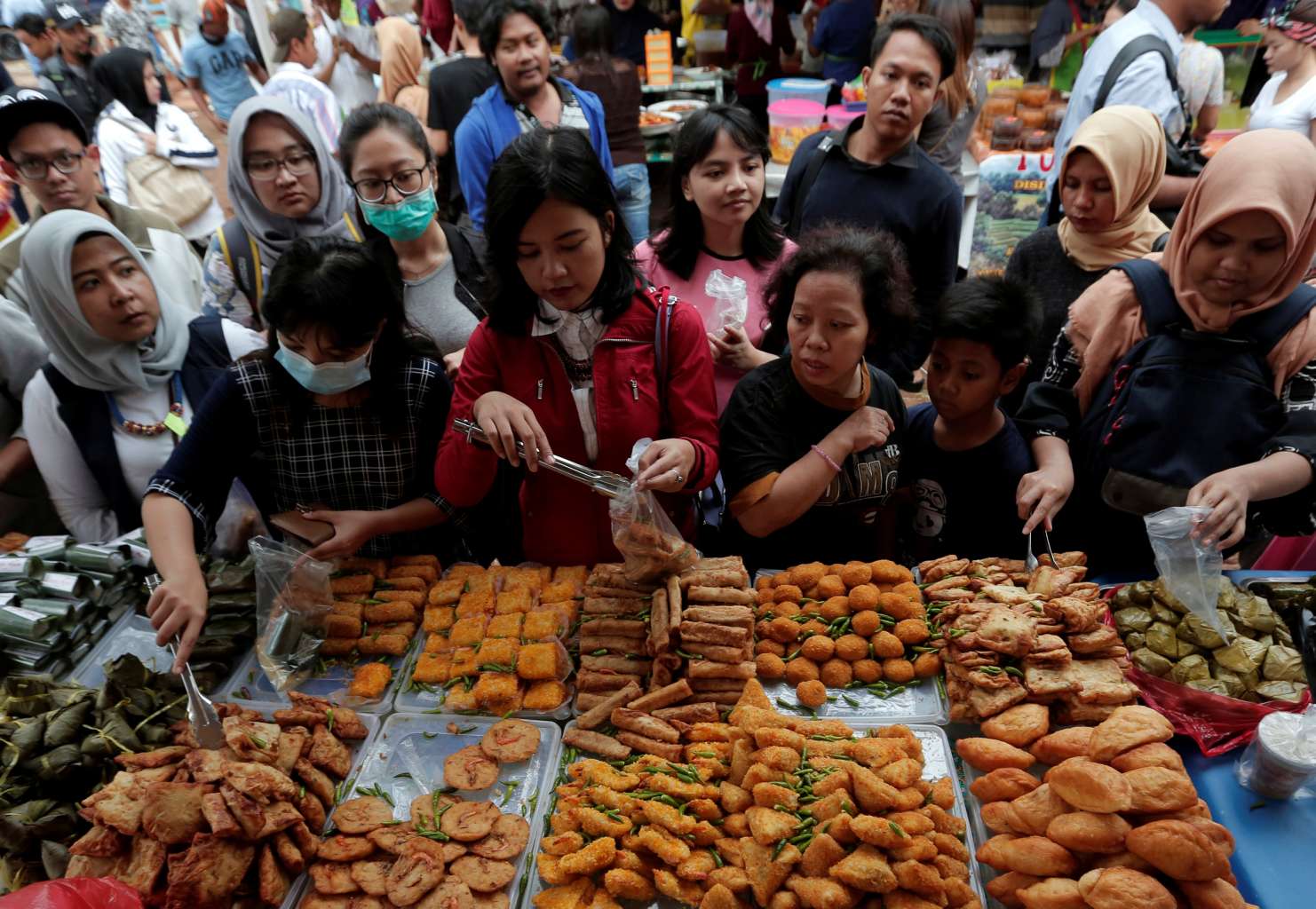 People buy food at a food market in Jakarta.