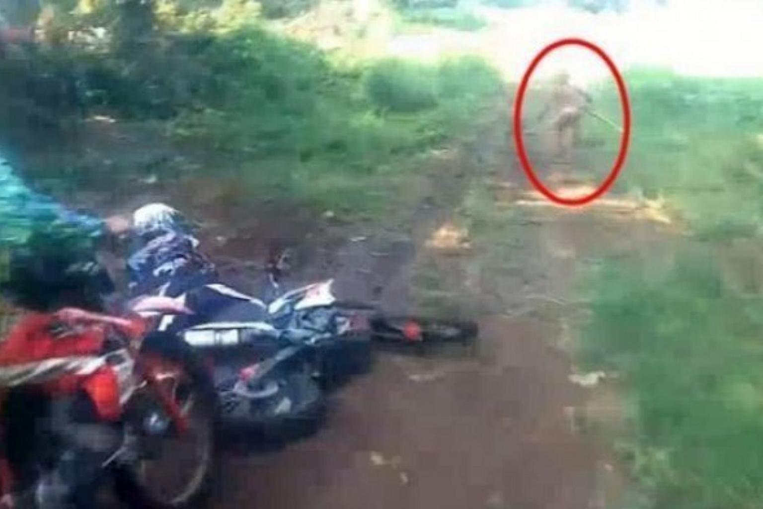 The mysterious figure, carrying a wooden stick, was spotted by some bikers at an Indonesian forest.