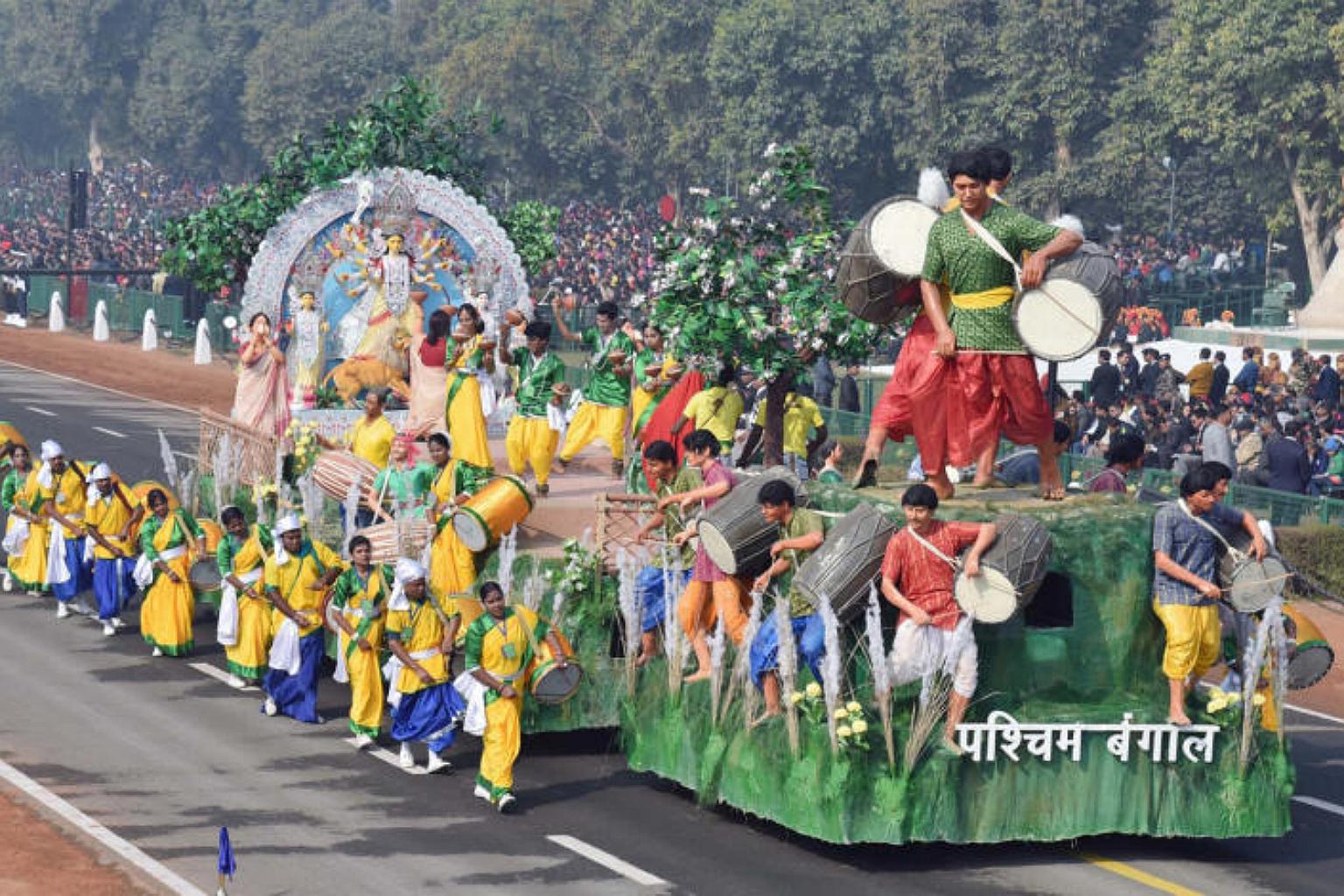 The float from West Bengal depicting Durga Puja passes through the Rajpath during the full dress rehearsal for the Republic Day Parade 2017, in New Delhi on Jan 23, 2017.