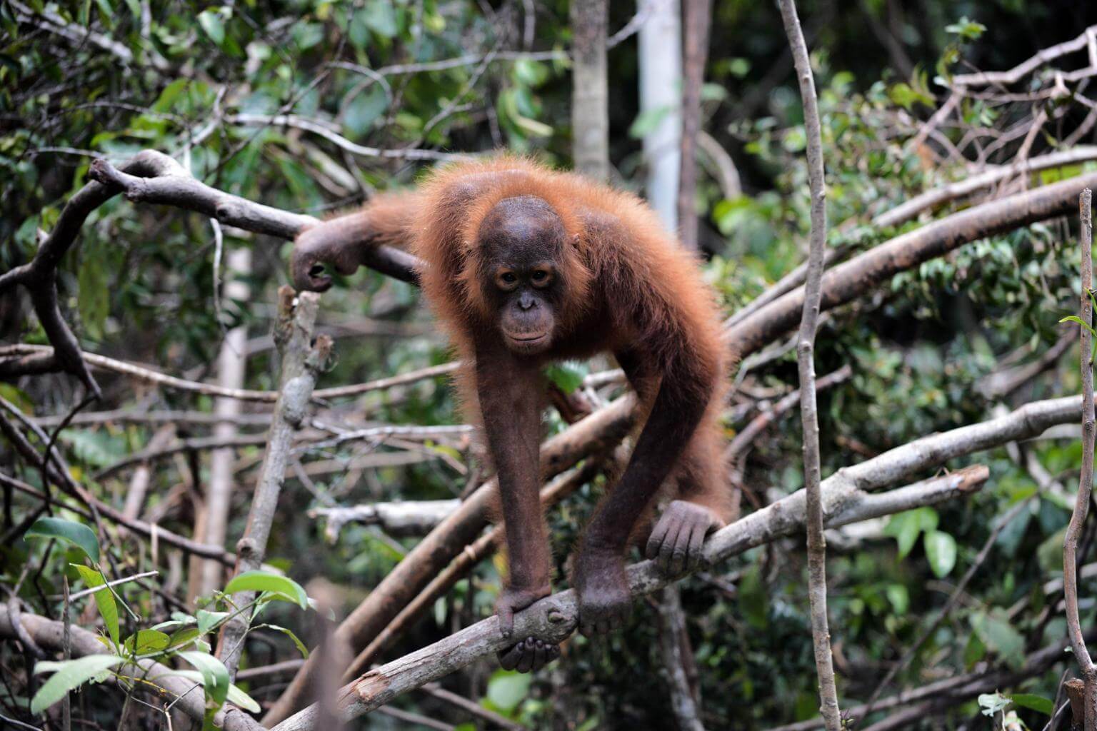 An orangutan at jungle school at the International Animal Rescue centre outside the city of Ketapang in West Kalimantan.
