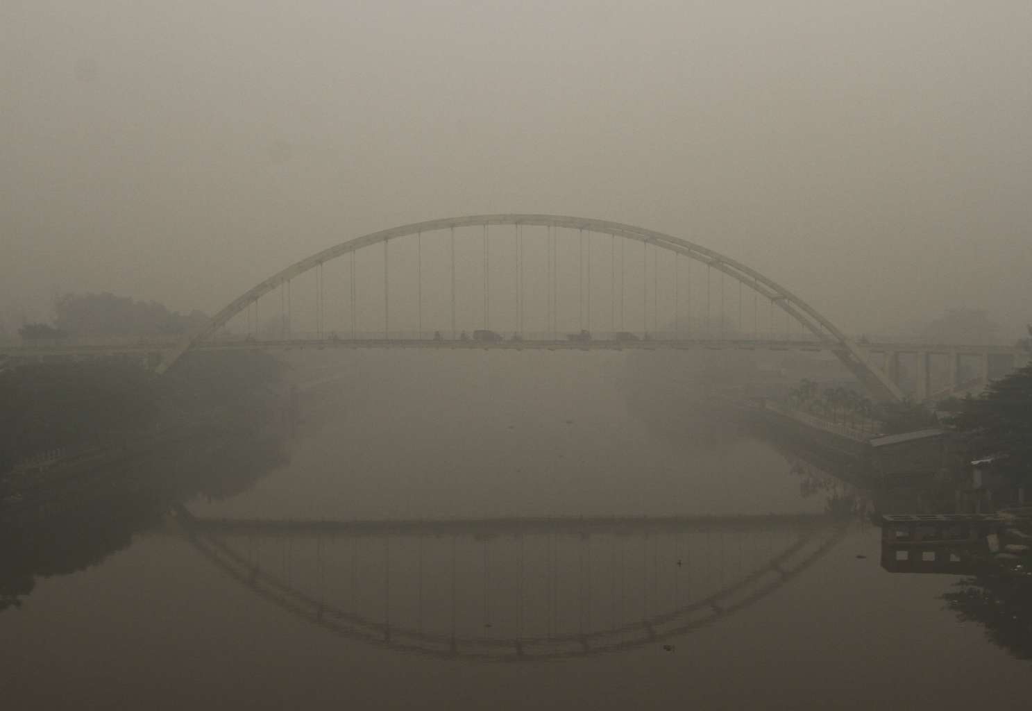 Vehicles drive on a bridge over the Siak river in the haze covered city of Pekanbaru, Riau Province on the Indonesian island of Sumatra, on Sept 14. 2015.