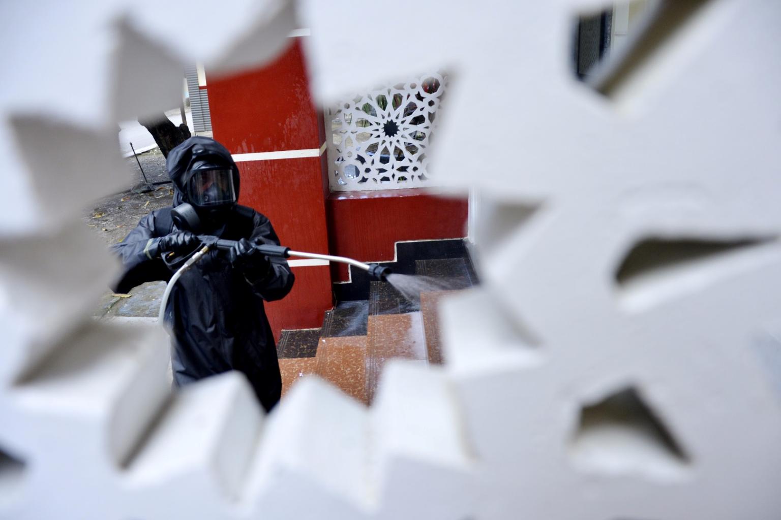 A police officer wearing a protective suit sprays disinfectant at a mosque in Makassar, Indonesia, on March 16, 2020.