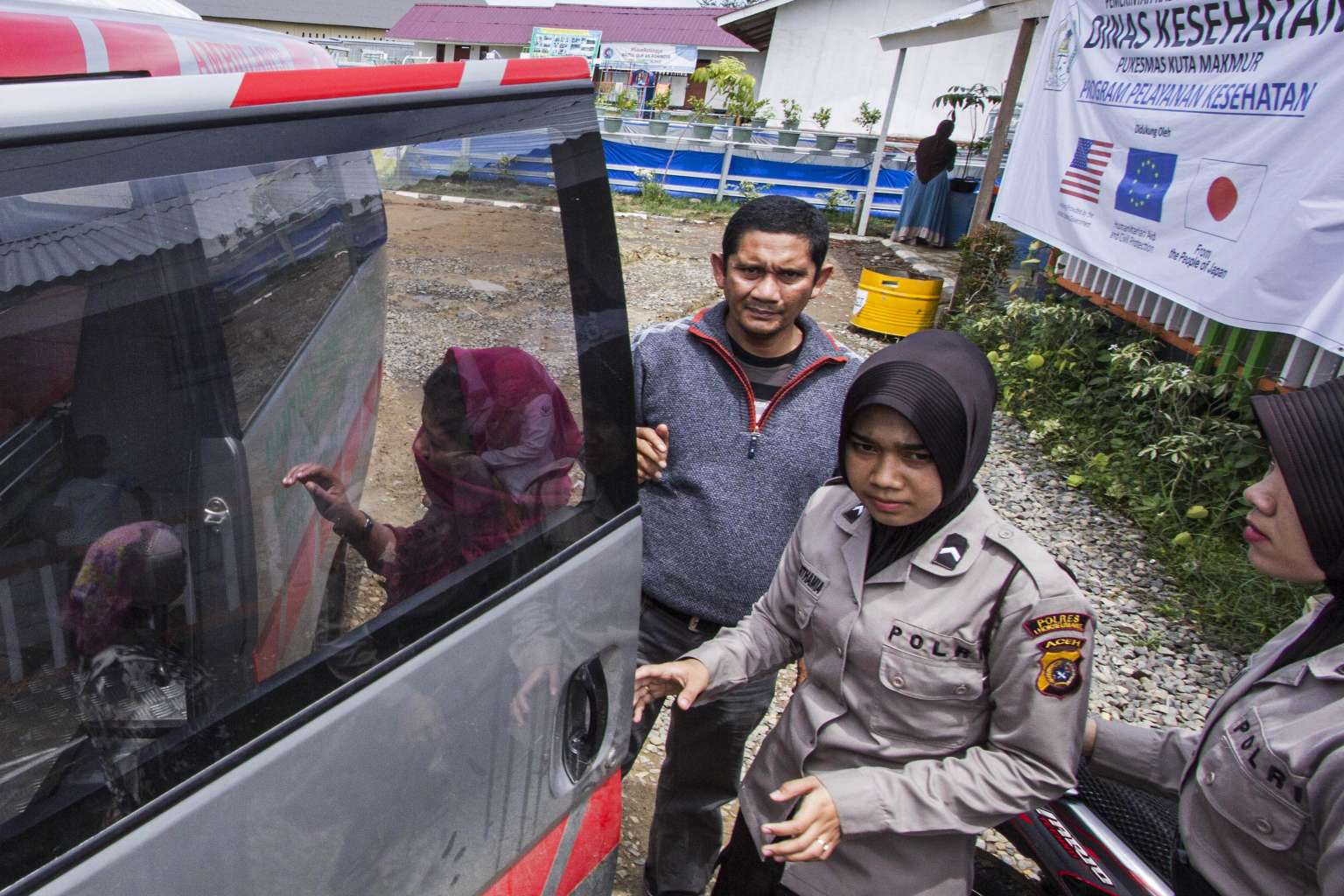 Indonesian policewomen an escort a Rohingya woman, an alleged rape victim, into an ambulance at the Rohingya camp in Blang Adoe in Aceh province on Sept 30, 2015.