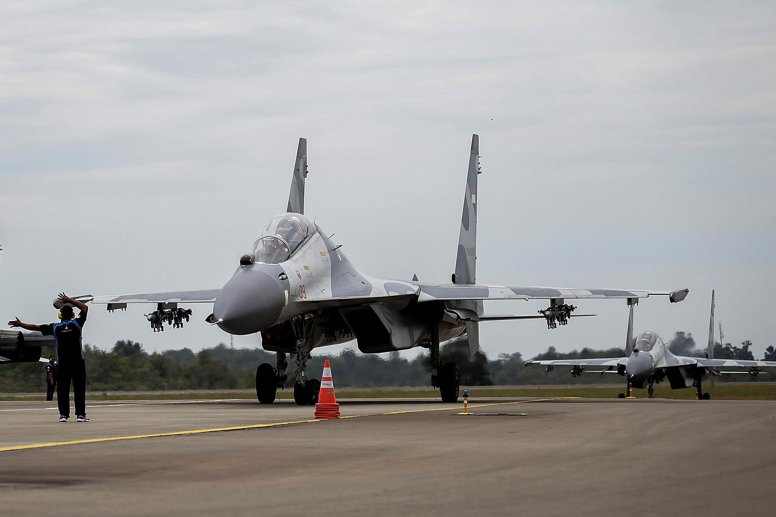 Indonesian Air Force Sukhoi fighter jets land after training for an upcoming military exercise at Hang Nadim Airport, Batam, Riau Islands, Indonesia on Oct 3, 2016.