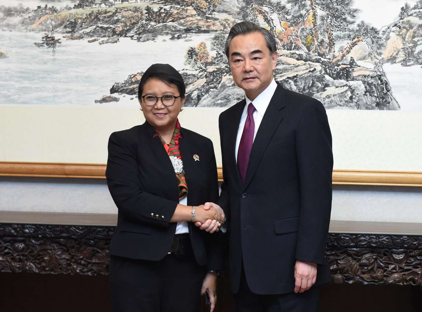 Chinese Foreign Minister Wang Yi meets his Indonesian counterpart Retno Marsudi ahead of the Belt and Road Forum in Beijing on May 13, 2017.