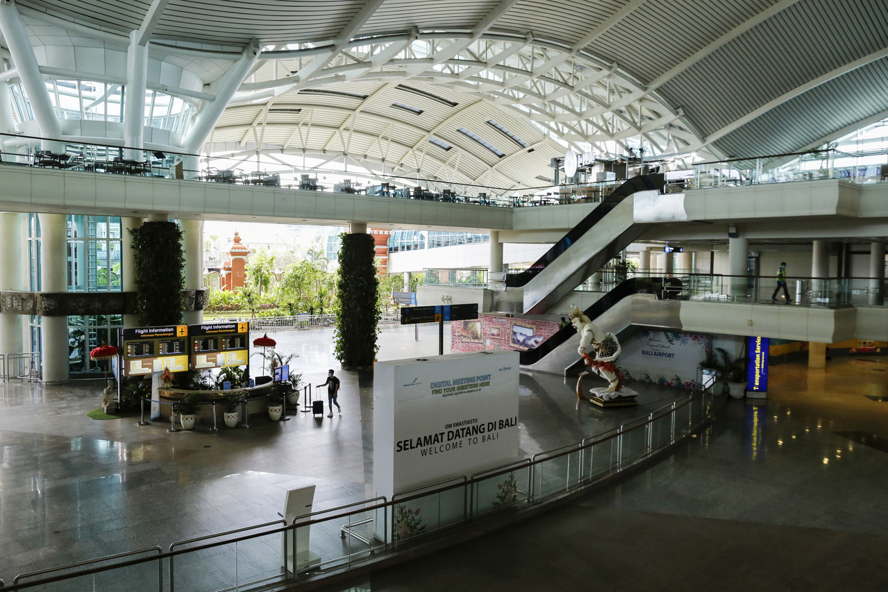 A traveller walks through a nearly empty international arrivals terminal of Gusti Ngurah Rai airport in Bali, on April 1, 2020.