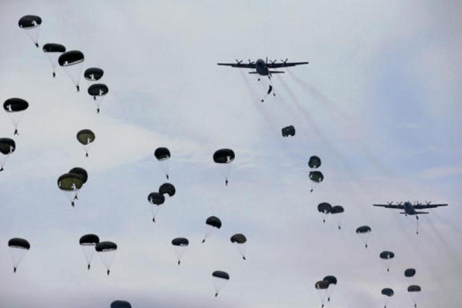Indonesia soldiers jump from a Hercules C-130 military transport plane during an exercise at Ranai military airbase in Natuna Island, Indonesia, on Oct 6, 2016.