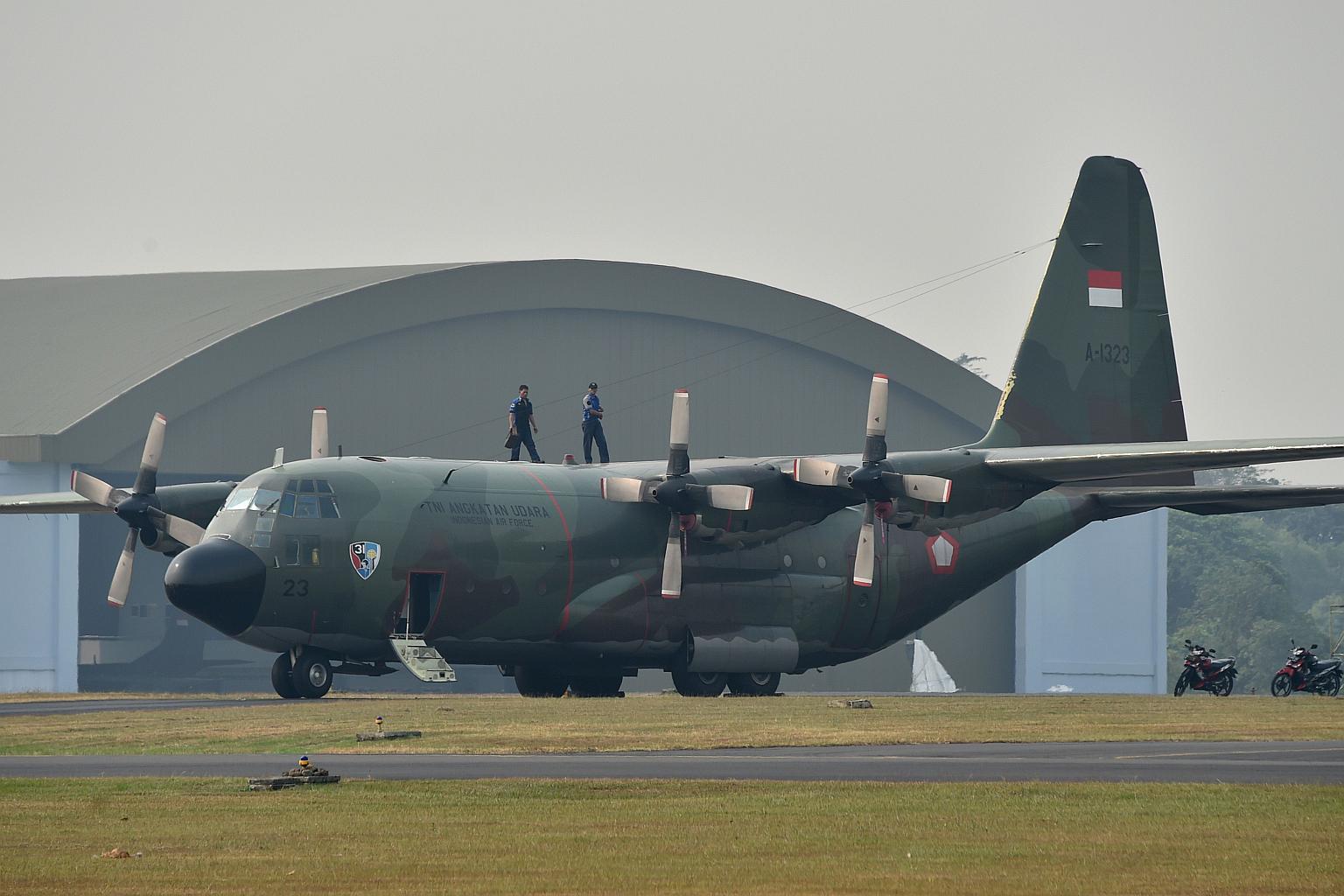 An Indonesian Air Force C-130 Hercules aircraft parked on the tarmac at Halim Air Base in Jakarta.
