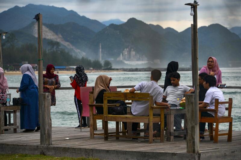 People gather at a cafe which reopened for visitors along a beach at Lhoknga, Aceh province on July 19, 2020.
