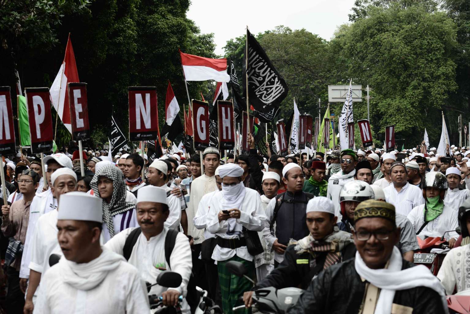 Thousands of Indonesian Muslims march in protest gainst Jakarta governor Basuki Tjahaja Purnama outside his office in Jakarta on Oct 14, 2016.