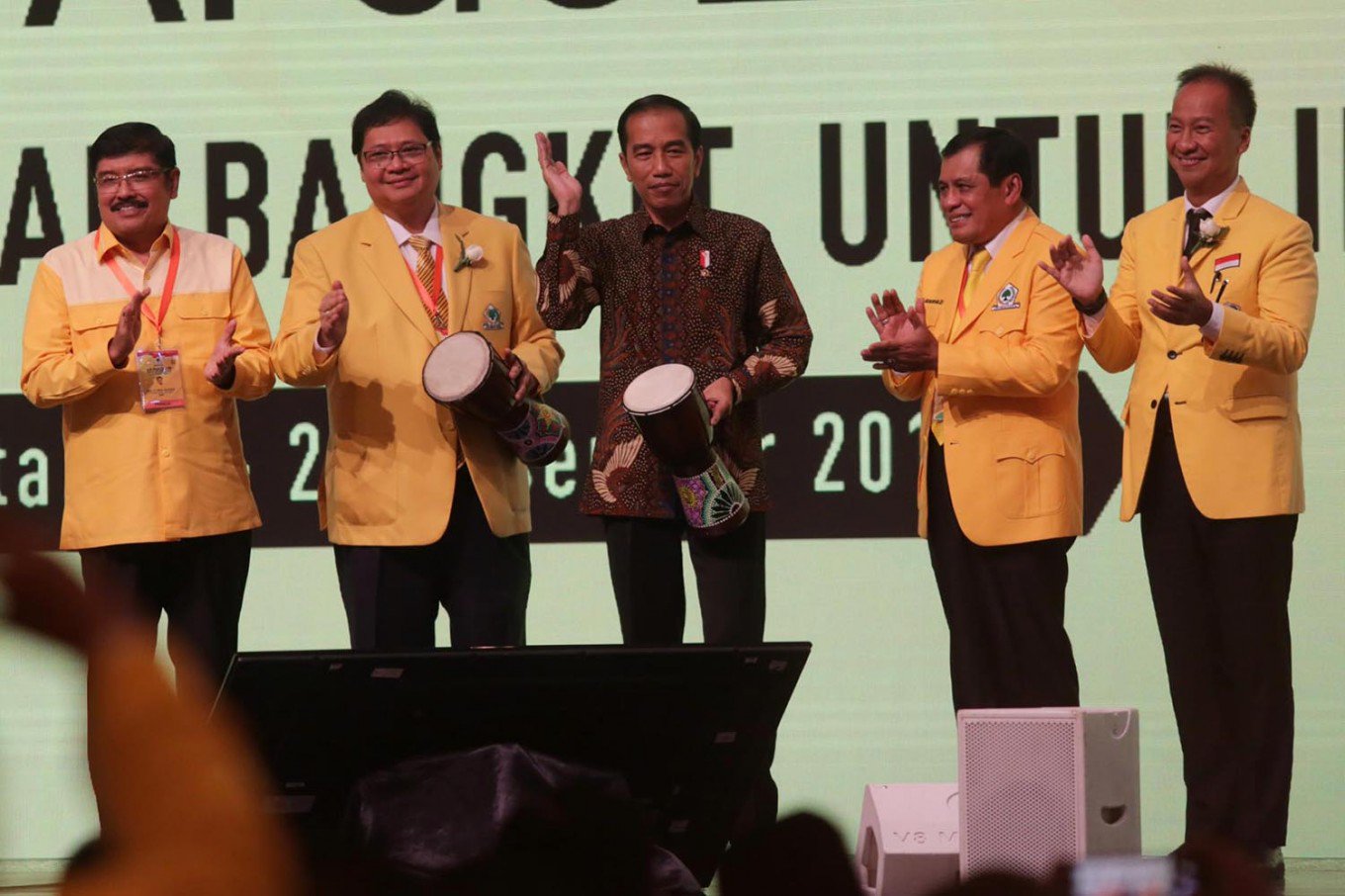 Indonesian President Joko Widodo (centre), with Golkar Party politician Ibnu Munzir (left), newly-elected party chairman Airlangga Hartarto (second left) and two other Golkar politicians, Nurdin Halid (second right) and Agus Gumiwang Kartasasmita (right), at the opening of the party's meeting.