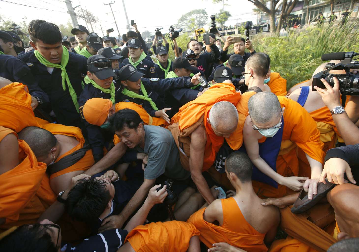 Thai Buddhist monks and their supporters scuffling with police officers outside Dhammakaya Temple in Pathum Thani province, on the outskirts of Bangkok, on Feb 20, 2017.